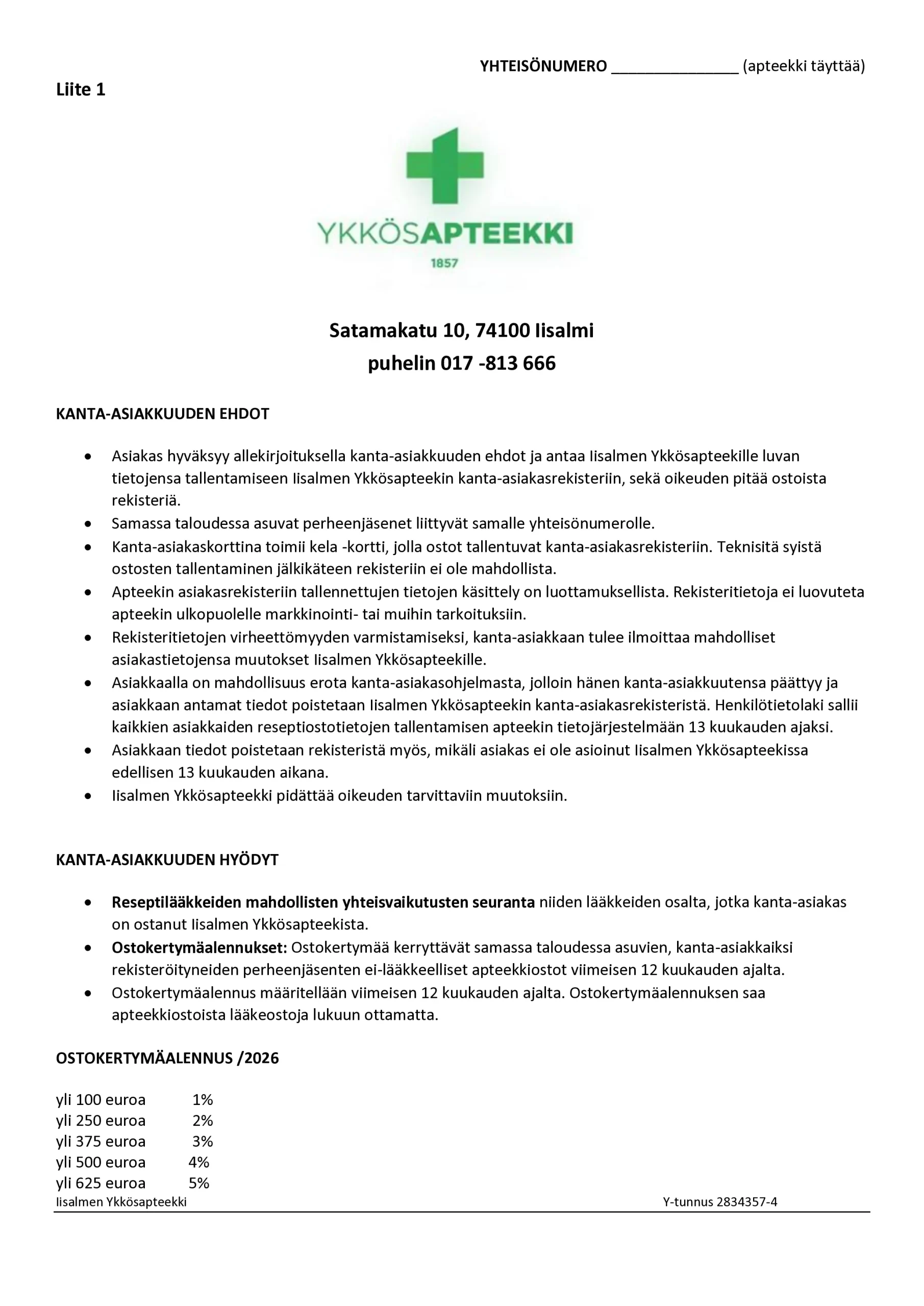 • Asiakas hyväksyy allekirjoituksella kanta-asiakkuuden ehdot ja antaa Iisalmen Ykkösapteekille luvan tietojensa tallentamiseen Iisalmen Ykkösapteekin kanta-asiakasrekisteriin, sekä oikeuden pitää ostoista rekisteriä.